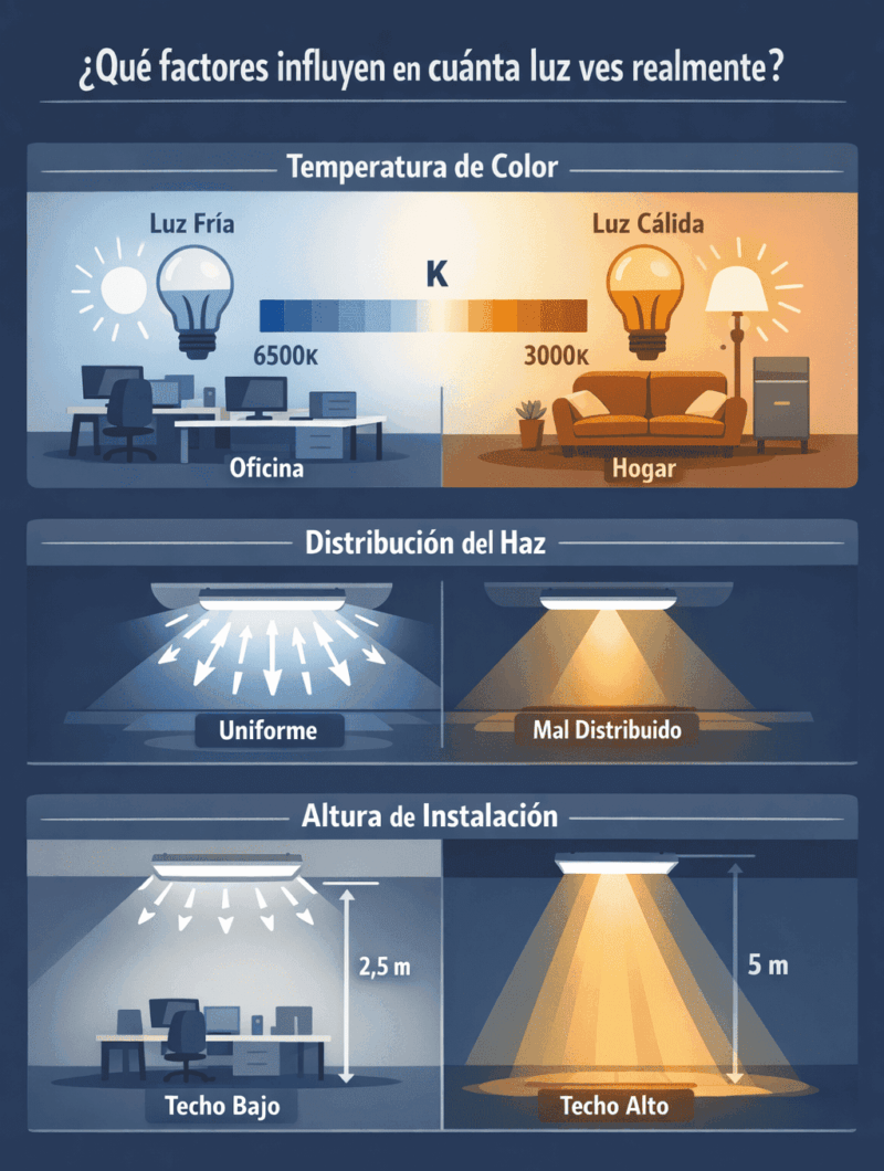 También entra en juego la reflectancia del entorno. Paredes claras, techos blancos y superficies que reflejan bien la luz ayudan a aprovechar mejor los lúmenes disponibles. Recuerda que para conseguir la misma percepción de luminosidad en espacios oscuros o con materiales absorbentes, se necesita un nivel de iluminación más elevado.
