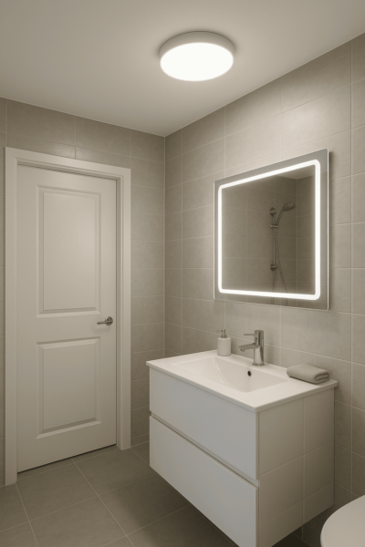 • Baño: En el baño, asegúrate de instalar plafones con alta protección IP (preferiblemente IP44 o superior) para resistir la humedad. Además, procura que proporcionen una iluminación clara y funcional, especialmente alrededor del espejo, para tareas como el maquillaje o el afeitado.