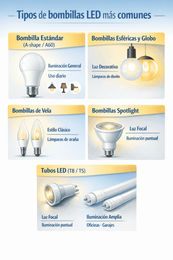 Una de las inquietudes más frecuentes cuando se discute sobre clases de bombillas LED es cómo comenzar la comparación. La forma más práctica es agruparlas según tres criterios claros: su forma, el uso que se les va a dar y las funciones que ofrecen. Así es mucho más fácil filtrar opciones y no comprar a ciegas.